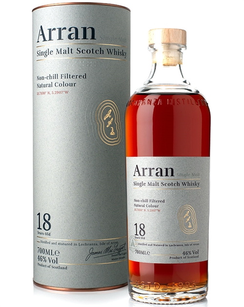 Arran 18 års whisky fra den lille ø Lochranza, hvor destilleriet Arran ligger. Whiskyen er Non Chill Filtered, dvs. ikke kølefiltreret og har naturlig farve - Natural Colour. Whiskyen er lagret på en kombination af 1st fill og 2nd fill hogsheads samt bourbon barrels, som har fået en afslutning på 1st fill Oloroso sherryfade. Det er en "sherry bombe" der har en flot dybde i smagen og viser alle de mange nuancer så som karamelliseret citrus og noter af tropiske frugter med en baggrund af brændt eg. Nyd Arran 18 år i et Glencairn glas.