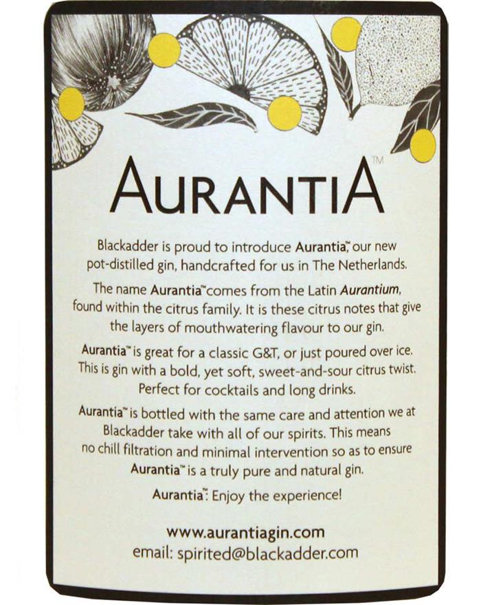 Robin Tucek står bag firmaet Blackadder, han er mest kendt for sine Raw Cask whiskyer - men har fået lavet denne super gin i Holland efter sine egne specifikationer. Prøv og tilsæt en skive fra en citron til denne lækre Aurantia Gin Small Batch. Det ser både festlig ud og giver smag til drinken. Intens i duften. En kompleks og smagsfuld gin med enebær, citron og masser af krydderier. Lang vedvarende eftersmag og en gin der sagtens kan nydes straight
