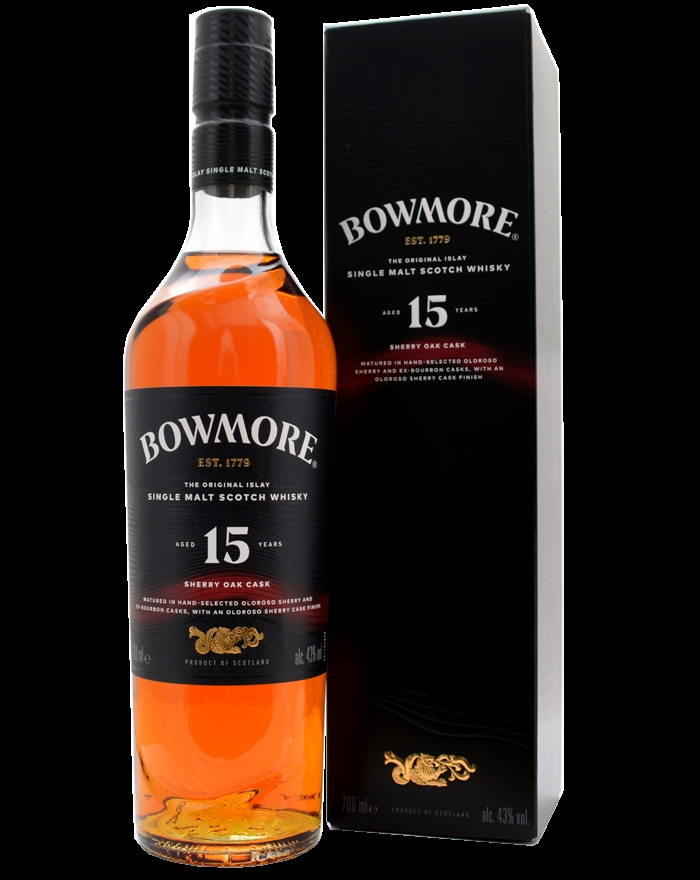 Bowmore 15 år Sherry Oak Cask Finish kombinerer Islays karakteristiske røgede stil med en rig, frugtagtig sødme fra spanske sherryfade af egetræ.
