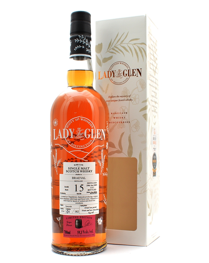 Braeval 15 års whisky fra den uafhængige whiskykøbmand Lady of the Glen. Vi har fornøjelsen af at præsentere en Single Cask aftapning, som har givet 182 flasker. Denne Limited Release, har lagringen på et Refill Butt, som har givet masser af smag til denne whisky. Den er både Un-chillfiltered og har Natural Colour. Aftappet ved fuld fadstyrke på 59,3%