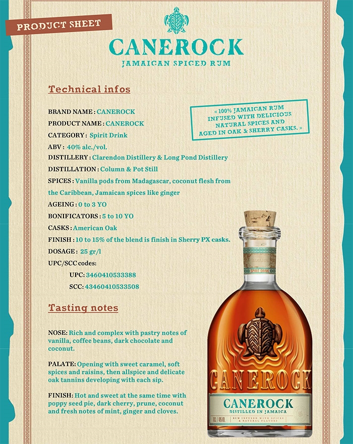 Canerock Jamaica Spiced Rum er et blend af 100% jamaicansk Pot Still rom fra de to velkendte destillerier Clarendon og Long Pond. Til dette blend er der tilsat nøje udvalgte naturlige ingredienser, såsom vanilje fra Madagaskar, jamaicansk ingefær og caribisk kokosnød. Herefter lagres rommen på PX sherryfade i 6 måneder, der afrundes med 25 g/liter sukkerrørsdosage.