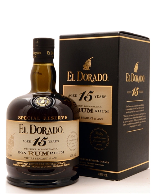 Dette er Demerara Destillers flagskib. El Dorado 15 års Special Reserve Rom har vundet guld ved et hav af konkurrencer i mange mange år. Senest blev den kåret som ”Verdens Bedste Rom” ved The International Wines & Spirit Competition i London, 2010. I denne blend af helt særligt udvalgte fadlagrede rom, er alle bestanddele mindst 15 år gamle. Nyd El Dorado 15 års rom med venner