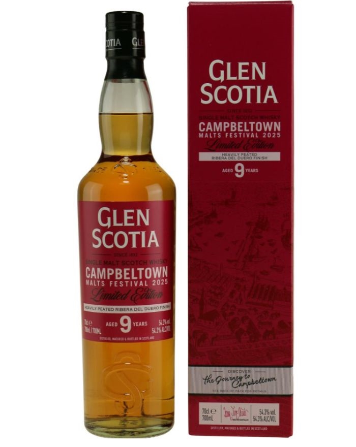 Glen Scotia Campbeltown Festival 2025 er en kraftfuld og røgfyldt single malt whisky, skabt som en limited edition til den årlige Campbeltown Malts Festival. Whiskyen er ni år gammel og har først lagret på first-fill bourbonfade, før den har fået en fem måneders finish på Ribera del Duero rødvinsfade, hvilket tilfører en intens frugtighed og dyb kompleksitet.