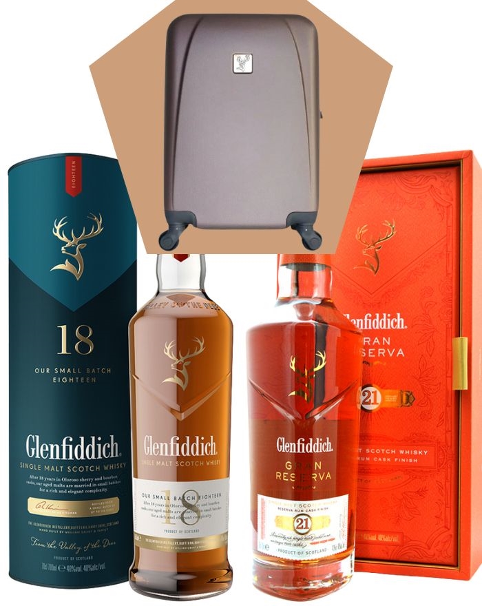 Køb en flaske 70 cl. Glenfiddich 18 års eller Glenfiddich 21 års Grand Reserva Rum Cask Finish og få en lækker Rejsekuffert med Glenfiddich logo