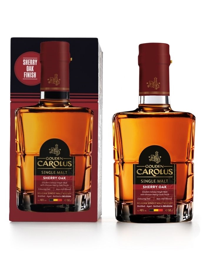 Gouden Carolus Single Malt Sherry Oak whisky er ligesom den prisvindende Goude Carolus Single Malt Whisky ved hjælp af masken fra Gouden Carolus Tripel øllen. Efter modningen har whiskyen lagret på sherry fade, som skaber en intens, frugtagtig whisky med strejf af moden frugt, vanilje og mørk chokolade