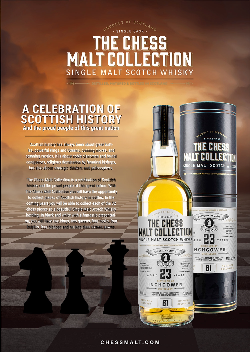 The Chess Malt Collection er en hyldest til Skotlands historie og dets stolte folk. The Chess Malt Collection giver dig muligheden for at samle stykker af Skotlands historie i flasker. I løbet af de kommende år kan du samle alle 32 skakbrikker i form af dejlige whisky flasker. Ligeligt fordelt i farverne sort og hvid vil du kunne samle 2 konger, 2 dronninger, 4 løbere, 4 springere, 4 tårne og ikke mindre end 16 bønder. 32 Single Malt Whiskies der alle repræsenterer forskellige aldre, fadtyper og udtryk fra forskellige destillerier. Alle flasker i The Chess Malt Collection er flasket som Single Casks Cask Strength uden koldfiltrering eller tilsætning af karamel. Dette er de rene dråber direkte fra fadet.