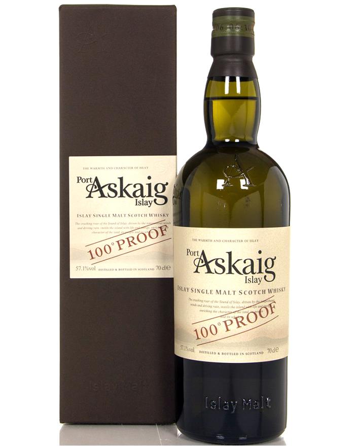 Den whisky vi skal se nærmere på, er Port Askaig 100 proof. Her er igen tale om en uafhængig aftapning, denne gang fra SMS. 100 proof refererer til den gamle britiske måleskala og betyder at denne whisky er flasket med 57,1% alkohol. Det er ikke angivet på flasken hvilket destilleri denne whisky kommer fra, men jeg kan fortælle at Caol Ila destilleriet er placeret i Port Askaig området.