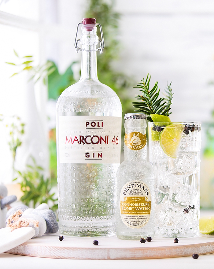 Efter 2 års udvikling er denne unikke gin klar til at brage ind på verdensmarkedet. Jacopo Poli har ikke spildt tiden, og denne gin er håndlavet og destilleret på et innovativt apparat, hvor der benyttes vakuum. Apparatet kaldes for et Crisopea vakum/Bain Marie-apparat. Denne særlige destilleringsform giver ginnen fine og bløde florale noter. Den har en clean og ren finish. Der er benyttet urter og planter fra det nordlige Veneto, og nærmere bestemt Asiago. Her kommer familien Poli også fra, så det giver en personlig relation mellem ginnen, de benyttede råvarer, og familien. Af botanicals kan nævnes Enebær, Moscatodruer, kardemomme, mynte, Cembra- og bjergfyrretræ og koriander. Især Moscatodruen giver ginnen sit særpræg og danner en klar association til Polis grappaer. Den er opkaldt efter nobelprismodtager og telefonens opfinder af telegrafen Guglielmo Marconi. Prøv Poli Marconi 46 Gin 70 cl