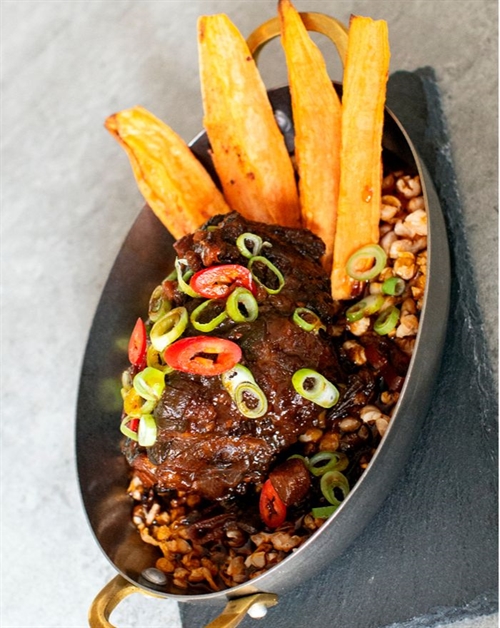 • Tag oksehalerne op ad posen og brun dem af i en tykbundet gryde i lidt olie sammen med det hakkede løg. Hæld fond og marinade over, læg låg på og lad det hele simre ved svag varme i tre timer.