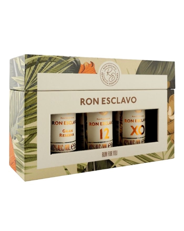 Ron Esclavo Mini Gavesæt Denne Ron Esclavo Mini Box indeholder de tre Ron Esclavo: Esclavo Grand Reserva, Esclavo 12 og Esclavo XO i 5 cl flasker. Det giver dig en unik mulighed for at smage og sammenligne disse populære rom produceret af 1423.dk.