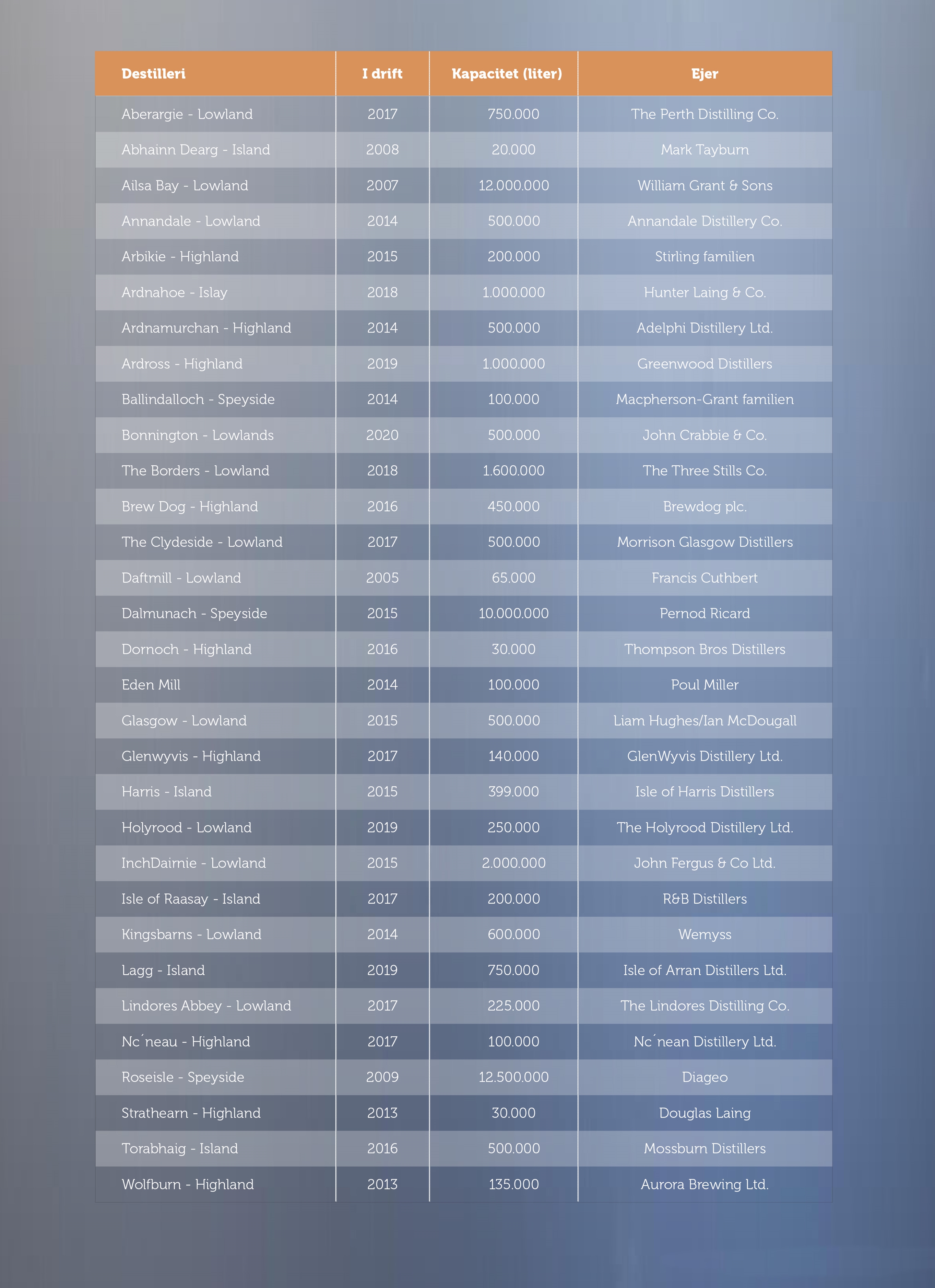 Og ja, vi har sikkert glemt en enkelt eller to, som er begyndt at producere. men som endnu ikke figurerer i de tilgængelige fortegnelser over skotske destillerier.
