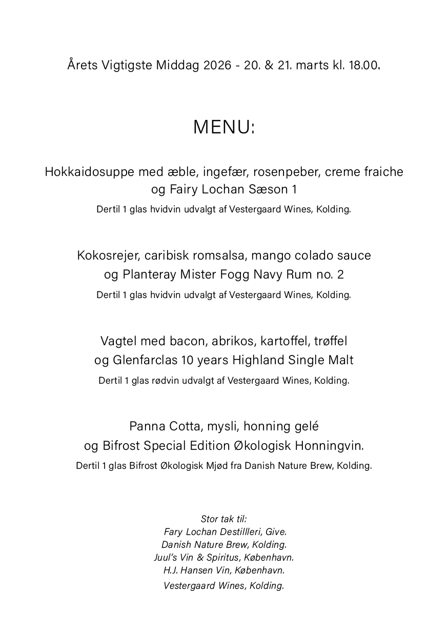 Den 20. og den 21. marts kl. 18.00 har vi fornøjelsen af at byde på en eksklusiv 4-retters middag inklusive drikkevarer i vores hyggelige lokaler i Sjølund.