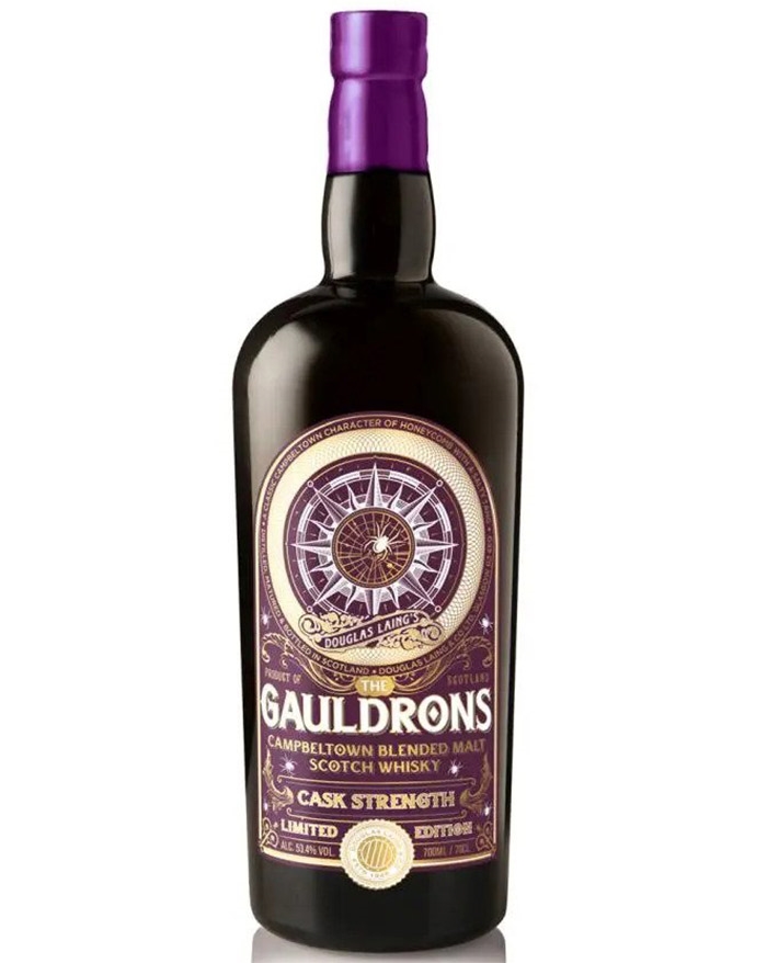 The Gauldrons Cask Strength er en del af den nye serie fra Douglas Laing - de tager det bedste whisky fra destillerier i området Campbeltown og mixer sammen, så det bliver en Blended Malt Scotch Whisky. Whiskyen er produceret i et begrænset oplag med 3120 flasker, som tilbyder en velafbalanceret røget og sødmefulde karakter . Etiketten er selvlysende, når det bliver mørkt.