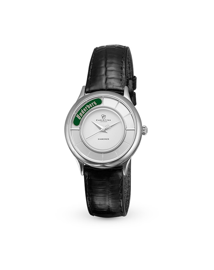Underberg collect dame-ur Med tidens puls - klassisk, men alligevel moderne. Collect-uret med det smukke håndmalede Underberg-logo i emalje og ægte sølv, der bevæger sig inde i uret. Et smukt armbåndsur til damer fra Underberg, i stål med element, designet af Christina Jewelry and Watches.