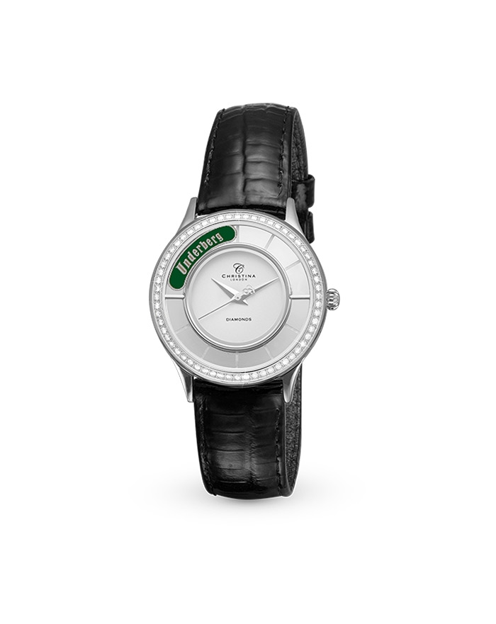 Underberg collect dame-ur Med tidens puls - klassisk, men alligevel moderne. Collect-uret med det smukke håndmalede Underberg-logo i emalje og ægte sølv, der bevæger sig inde i uret. Et smukt armbåndsur til damer fra Underberg, i stål med element, og en topring med 60 hvide sten, designet af Christina Jewelry and Watches. Du kan nemt udskifte basis-topringen, som sidder på uret, og erstatte den en af de mange skønne topring, fra Underberg.