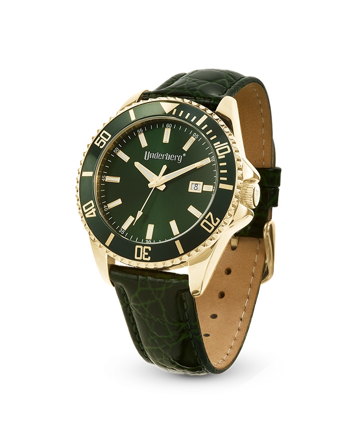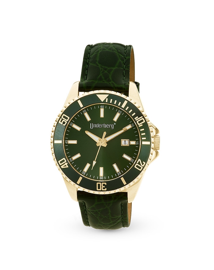 Underberg Herreur Et ægte Underberg herreur, med den smukke grønne farve. Med en dato, så du ikke er i tvivl om, hvilken dag det er. Remmen er i ægte læder med den grønne farve fra Underberg. Uret er med ridsefrit safirglas og vandtæt til 100 meter. Et smukt armbåndsur fra Underberg, i forgyldt stål, designet af Christina Jewelry and Watches.